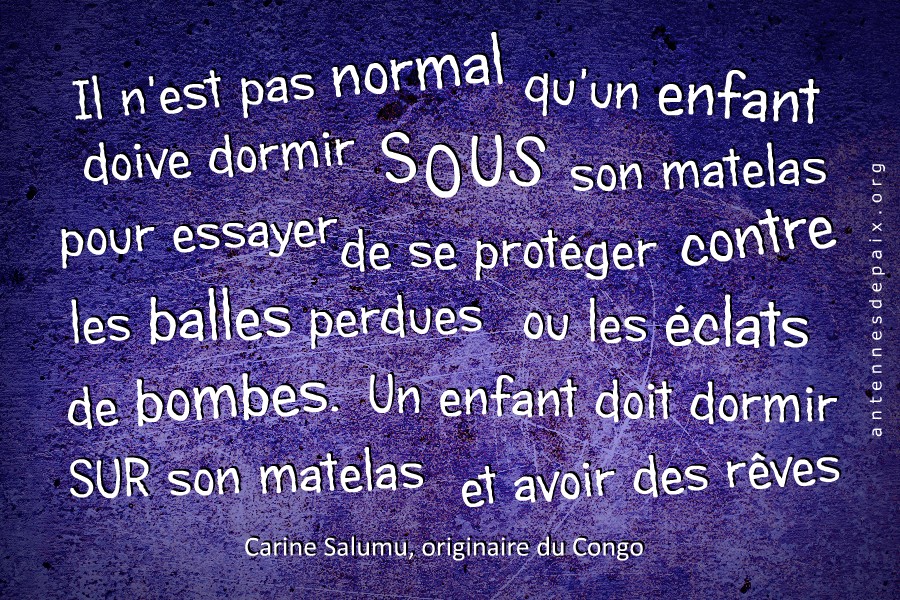 Je termine en vous disant une petite chose : malgré la souffrance que j’ai endurée, je sais que Dieu était avec moi et ma famille. C’est Lui qui nous a sortis vivants de cette dure épreuve. J’espère que ce petit témoignage vous sensibilisera encore plus à la paix. Car, des milliers d’autres enfants vivent encore aujourd’hui au Congo en situation pire que moi durant de cette guerre qui n’en finit plus.