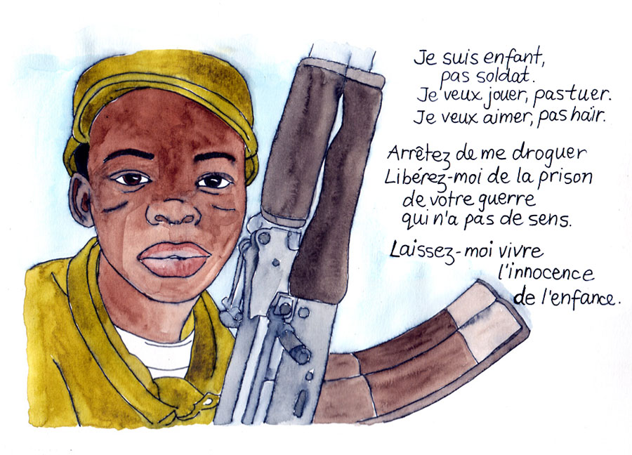Nous sommes révoltés de constater que 20 ans après la signature de la Convention internationale des droits des enfants par la quasi-totalité des pays, tant de jeunes sont devenus des enfants-soldats, que ce soit au service des milices rebelles ou des forces armées gouvernementales. L’augmentation des conflits violents augmente aussi le risque de recrutement d’effectifs parmi les moins de 18 ans.