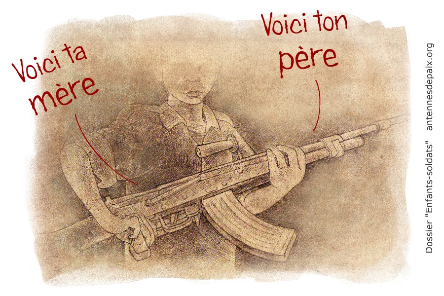 Des factions armées forcent des enfants à tuer leurs parents, père et mère. Après quoi la milice, leur nouvelle « famille », leur remet une mitraillette dans les mains en leur disant : « Voici ton père, voici ta mère, ne t’en sépare jamais! »