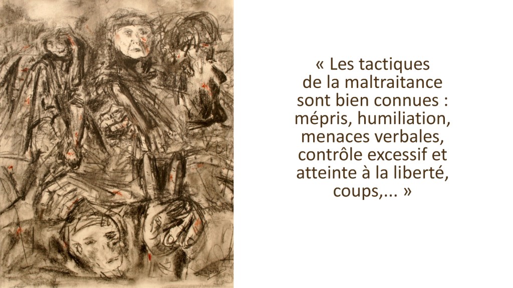 La violence se traduit dans des actes publics, mais très souvent dans l’intimité de la vie familiale ou derrière les portes anonymes d’une chambre d’hôtel. Quand une femme se barricade dans sa solitude et se drape de la soumission, du silence ou de la résignation, même armée du bouclier de l’espoir, elle montre sa vulnérabilité et son statut de victime d’un système violent; en somme, elle exprime le fait qu’elle commence à perdre sa bataille contre la haine. Elle se sent inoculée du venin de l’impuissance chronique silencieuse et insidieuse devant la montée graduelle de l’acharnement brutal. Les tactiques de la maltraitance sont bien connues : mépris, humiliation, menaces verbales, contrôle excessif et atteinte à la liberté, coups, etc. Dans une telle dynamique répétée au quotidien, une personne peut lancer des S.O.S. dans l’attente de réponses, mais trop souvent, son cri se perd dans les nuages de l’indifférence, de l’indolence, de l’ignorance crasse ou tout simplement de l’incompétence voire même de la condamnation; c’est un autre débat, mais nous pourrions ergoter longtemps sur les complications des services d’aide bureaucratisés. Alors, le drame se poursuit, prend de l’envergure et conduit à l’inéluctable épilogue, la mort de la femme.