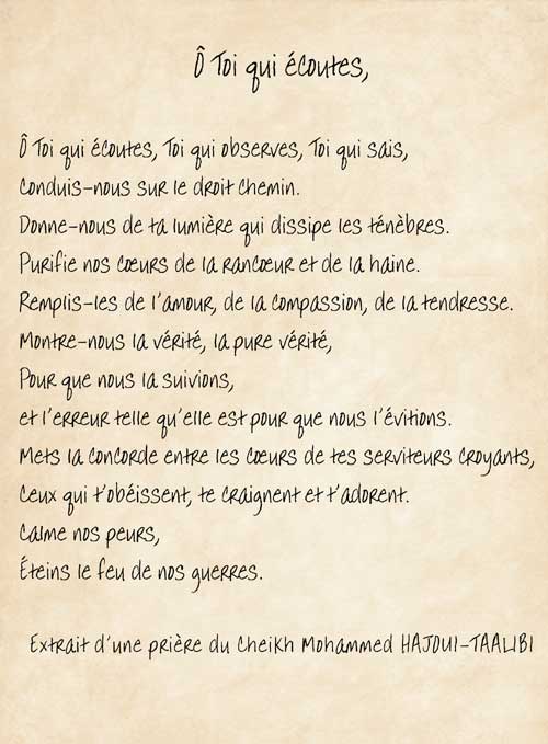 Nous vous proposons ci-dessous une prière musulmane qui montre à quel point l’appel le plus profond des croyants, qu’il s’agisse du judaïsme, du Christianisme, de l’Islam, du Bouddhisme ou d’autres, demeure avant tout un appel à la compassion, à la miséricorde et à la paix entre les peuples, cultures et religions.