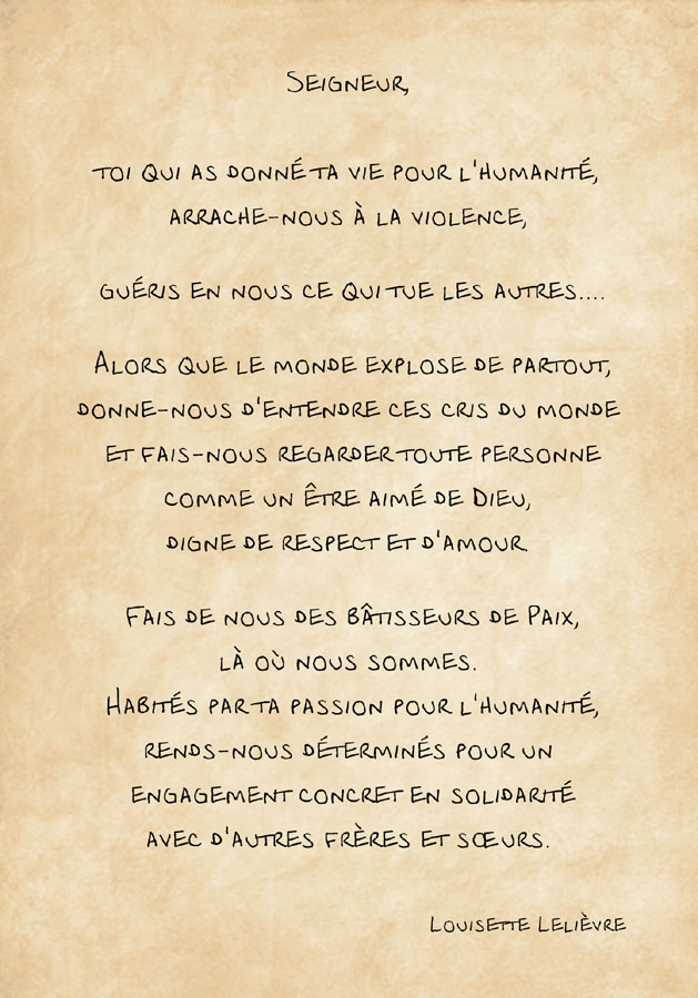 Qui a permis que l’on fasse de toi un Dieu de guerre et d’intolérance? Qui a permis qu’en ton nom l’un et l’autre puissent annihiler tant de vies, faire souffrir tant de femmes et d’enfants? Comment peut-on encore se prétendre fidèle et se justifier de ton Livre pour commettre les pires atrocités?