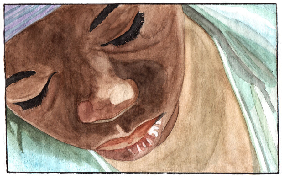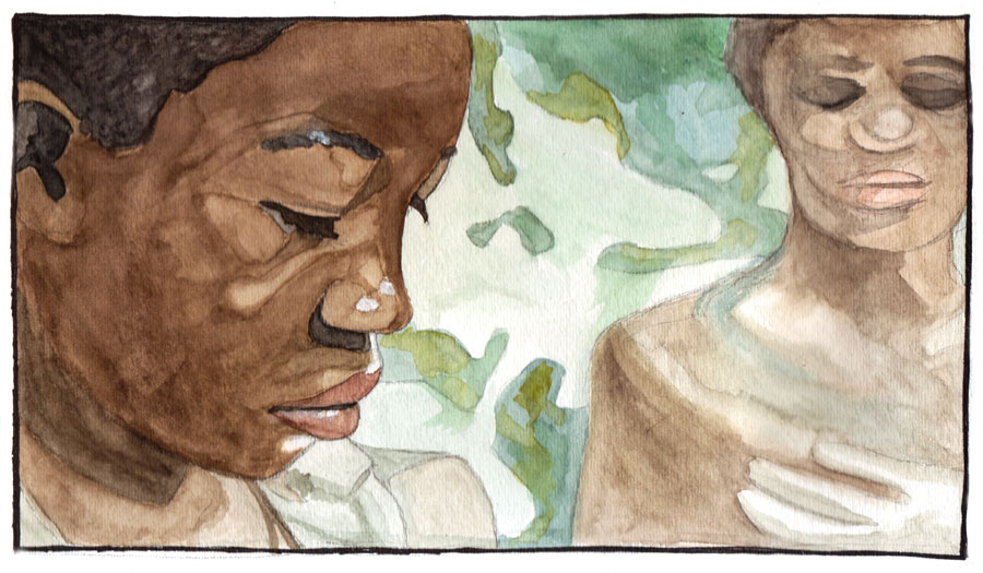 La scène est magnifique, empreinte de tendresse et de pudeur. Le doux clapotis de l’eau de la rivière accompagne cette scène lumineuse. Komona lave son bébé avec douceur. Dieu a répondu à sa demande, elle aime son enfant.