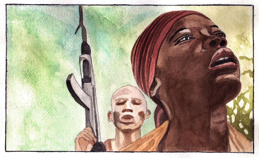 Les enfants montent la garde du camp et boivent de la sève magique. Un jour, alors qu’ils montaient la garde autour du camp, raconte encore Ramona à l’enfant qu’elle porte, « il est venu beaucoup de soldats du gouvernement qui ont voulu voler le coltan du Grand Tigre. Alors j’ai pris ma kalach (comme appelle affectueusement Komona son arme) et on a gagné la bataille même s’il y avait plus de soldats devant moi que de cheveux sur ma tête ». On assiste alors à une scène de sauvagerie débridée des jeunes rebelles.